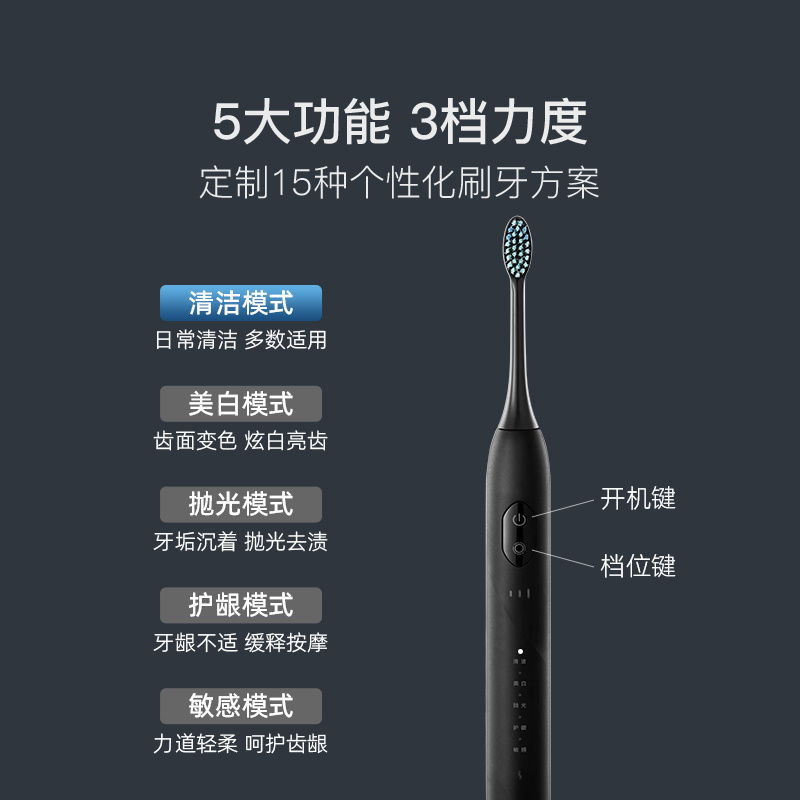 99.9%紫外线除菌,每天都用“新”刷头;5种功能x3档力度,共15种洁牙方案